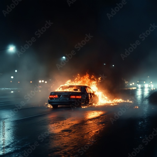 © Natasha , Obraz premium Dramatic nighttime car fire on wet street captured in intense urban scene.