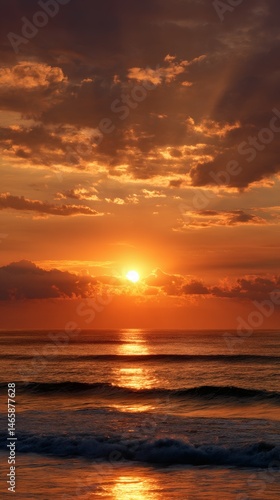 © EngineerJahid, Obraz premium Dramatic Ocean Sunrise with Colorful Clouds and Reflections on Calm Sea Waves