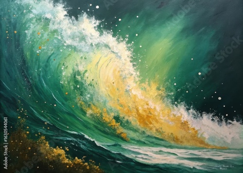 © Khadiza, Fototapeta premium Dramatic ocean wave crashing with sunlight breaking through
