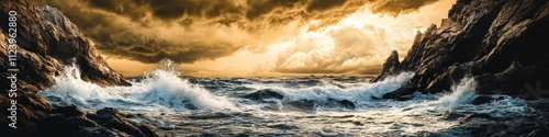 © Lycee, Obraz premium Dramatic Ocean Waves Crashing Against Rocky Cliffs During Sunset