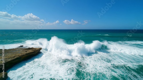 © Orawan, Fototapeta premium Dramatic Ocean Waves Crashing Against Rocky Coastline under a Sunny Sky