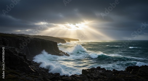 Obraz premium Dramatic Ocean Waves Crashing on Rocky Cliffs with Sun Rays