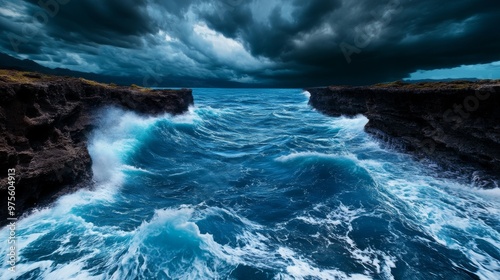 © A4719, Obraz premium Dramatic Ocean Waves Crashing Through Rock Formation Under Dark Storm Clouds