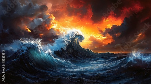 © Tcukimay, Fototapeta premium Dramatic ocean waves crashing under a fiery, stormy sunset sky.