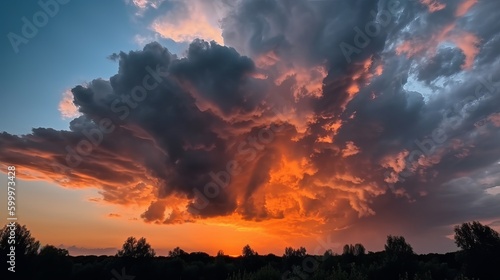 © Suleyman, Naklejka premium dramatic orange clouds in the blue sky at sunset Generative AI