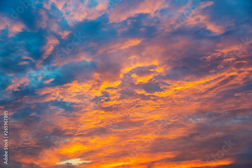 © Delphotostock, Fototapeta premium Dramatic orange sky with clouds at sunset