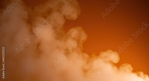 © NN AI, Naklejka premium Dramatic orange smoke clouds billowing against dark sky creating atmospheric weather phenomenon. Dense vapor formations with intense color saturation. Natural disaster and climate concept