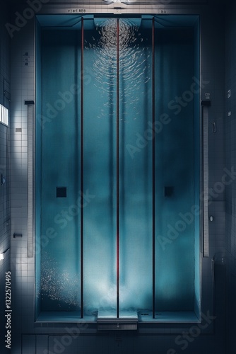 Fototapeta premium Dramatic overhead view of an empty indoor swimming pool with still water and...