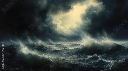 Obraz premium Dramatic painting of stormy sea under dark clouds with light piercing through.