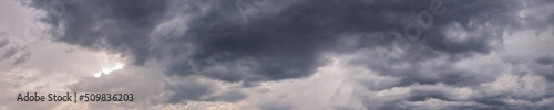 Obraz premium Dramatic panorama sky with storm cloud on a cloudy day. Panoramic image.