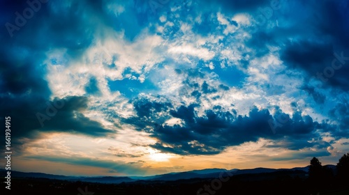 Fototapeta premium Dramatic panoramic landscape with expansive skies, dynamic clouds, silhouetted hills,