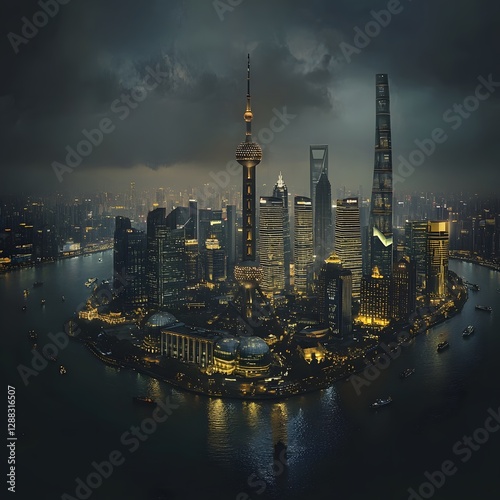 © imagincy, Fototapeta premium Dramatic Panoramic View of Futuristic Shanghai Skyline with Towering Skyscrapers and Oriental Pearl Tower