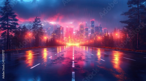 Fototapeta premium dramatic perspective of empty urban highway leading to futuristic city skyline neon lights cyberpunk atmosphere
