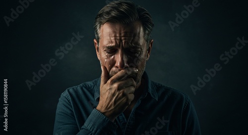 Fototapeta premium Dramatic Portrait of a Man Crying, Tears Streaming Down His Face with Emotional Anguish