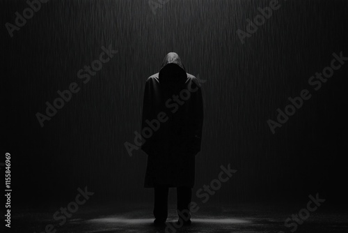 Obraz premium Dramatic Portrayal of Depression: Man in Rain, Dark and Alone
