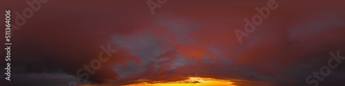Naklejka premium Dramatic red burning dark sunset sky panorama. Hdr seamless spherical equirectangular 360 panorama. Sky dome or zenith for 3D visualization and sky replacement for aerial drone 360 panoramas.