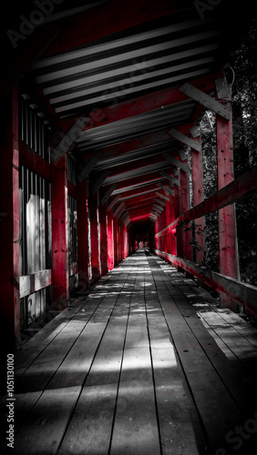 Fototapeta premium Dramatic red corridor, high contrast black & white. Abstract perspective.