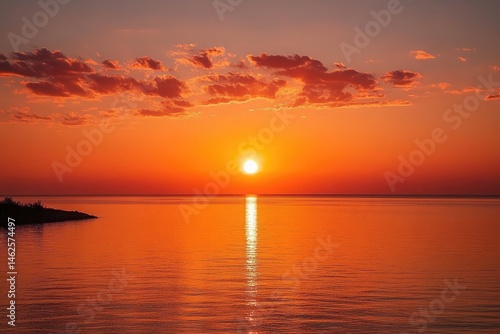 © Shahida, Fototapeta premium Dramatic Red Orange Sky With Sun at Sunset Reflecting Over the Calm Sea and Clouds