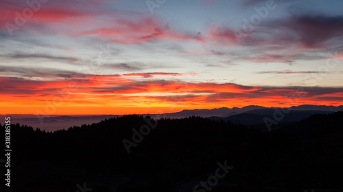 © elleonzebon, Obraz premium Dramatic red sky on dark woodland