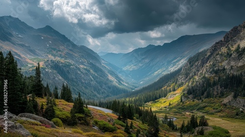 © Kitta Studio, Fototapeta premium Dramatic Rocky Mountain Pass Under Moody Clouds in Scenic Landscape