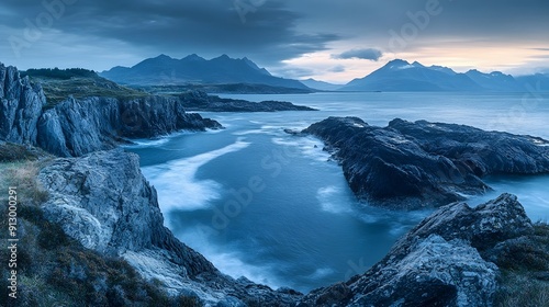 © Apple.smlie, Obraz premium Dramatic Rugged Shoreline with Distant Mountains