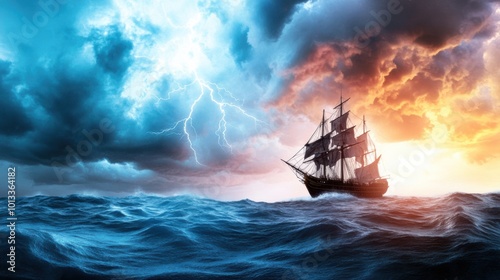 Fototapeta premium Dramatic Sailing Ship in Stormy Sea at Sunset