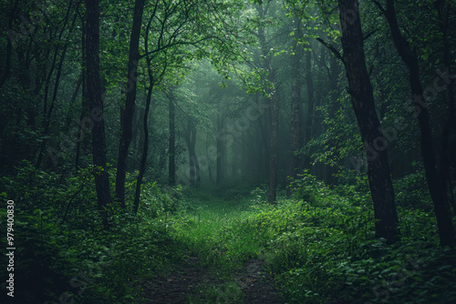 © Hunman, Fototapeta premium Dramatic, scary dark forest with green bushes.
