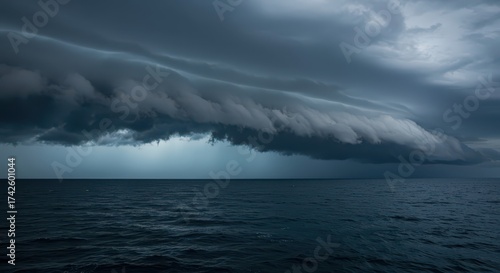 Naklejka premium Dramatic seascape showcases ominous, layered storm clouds hovering over the dark ocean water, creating a moody atmosphere filled with potential for intense weather, with deep blue and gray tones...