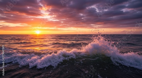 Naklejka premium Dramatic Seascape: The sun dips below the horizon, painting the sky with fiery hues as ocean waves crash in a beautiful sunset. Capturing the power and beauty of the ocean.