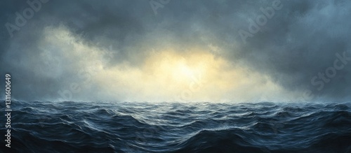 Fototapeta premium Dramatic seascape with dark gray and blue waves under an overcast sky golden rays breaking through clouds creating a turbulent ambiance
