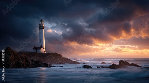 © twilight mist, Naklejka premium Dramatic seascape with lighthouse at sunset.