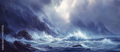Fototapeta premium Dramatic seascape with tumultuous waves crashing against rugged rocks amidst...