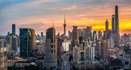 © zhao dongfang, Obraz premium Dramatic Shanghai skyline with modern architecture at sunset