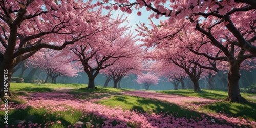 © vilavanh, Obraz premium dramatic shot of cherry blossom trees in bloom with vibrant pink flowers and lush green foliage, cherry blossom fields, floral landscapes, nature's wonder