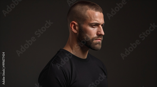 © Hamza, Fototapeta premium Dramatic side profile of a muscular man with a buzz cut, wearing a black shirt, dark background