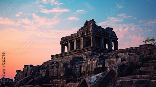 Obraz premium Dramatic silhouette of the Preah Vihear Temple perched on a cliff, with the sun setting behind it,