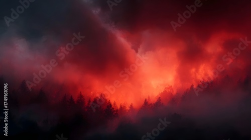 © Bussakon, Fototapeta premium Dramatic sky ablaze with red and orange smoke over a dark forest silhouette