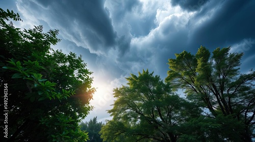 © the, Obraz premium Dramatic Sky Above Trees with Sunlight Breaking Through Storm Clouds