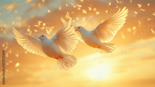 © Paul, Fototapeta premium Dramatic sky funeral background featuring a graceful white dove with ample space for text insertion