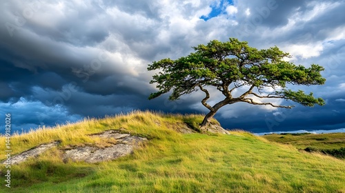 Obraz premium Dramatic Sky, Lone Tree, Grassy Hill - Dramatic Lighting: The stron.