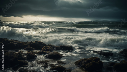 Obraz premium Dramatic sky over dark seascape, breaking waves generated by AI
