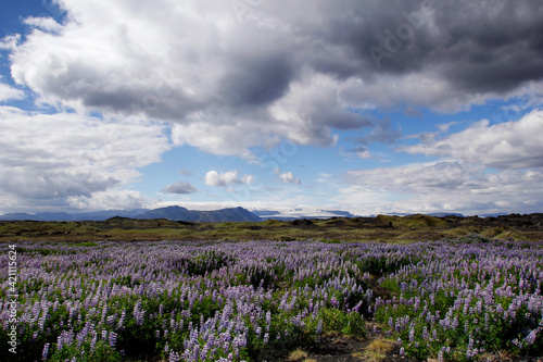 Obraz premium Dramatic sky over lupine field with Mýrdalsjökull in the background, Iceland