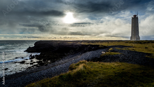 © Kris Hoobaer, Fototapeta premium dramatic sky with a lonely unrecognizable person in the distance at malarrif lighthouse at snaefellsnes peninsula in western iceland