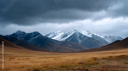 © Bussakon, Fototapeta premium Dramatic snow capped mountain range under a stormy overcast sky with golden grassland in the foreground