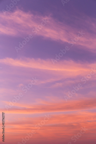 Fototapeta premium Dramatic soft sunrise, sunset pink violet orange sky with cirrus clouds...