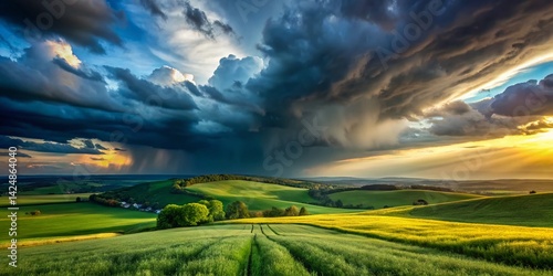 © Sirinporn, Obraz premium Dramatic Spring Storm Clouds Rolling Over Lush Green Landscape