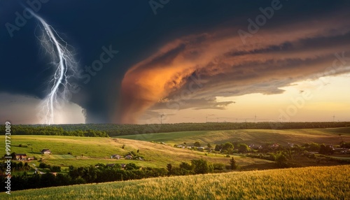 Obraz premium Dramatic Storm And Tornado. A dramatic storm at sunset producing a powerful...