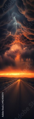 Fototapeta premium Dramatic storm clouds loom over a road at sunset, capturing a captivating...