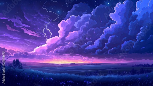 Fototapeta premium Dramatic storm clouds over an open prairie, with lightning in the distance