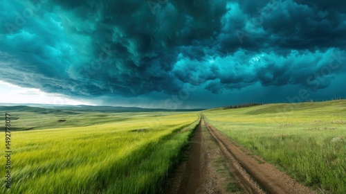 © EchoFrame, Fototapeta premium Dramatic Storm Clouds Over Green Field Landscape Wide Angle Rural Dirt Road Leading to Horizon
